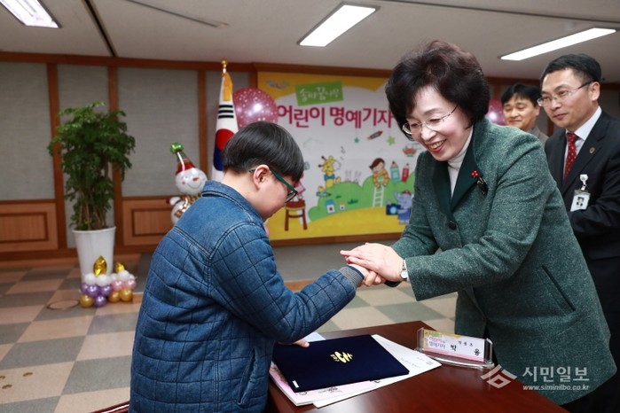 서울 송파구는 지난 1일 구청 대회의실에서 ‘송파꿈나무 어린이 명예기자 위촉식’을 개최했다. 사진은 행사에 참석한 박춘희 구청장이 신규 어린이기자에게 위촉장을 수여하는 모습.(사진제공=송파구청)