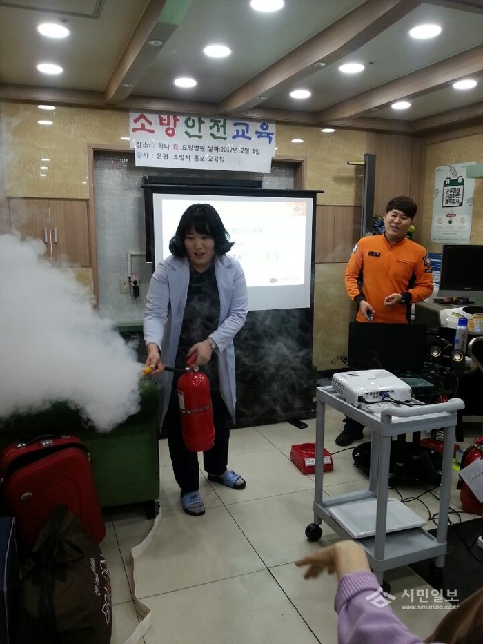 서울 은평소방서는 지난 1일 은평구 구산동에 위치한 하나효요양병원을 방문해 직원 50여명을 대상으로 화재예방 의식 함양과 안전사고 방지를 위한 '소방안전교육'을 실시했다. 사진은 직원이 소화기 사용실습을 하는 모습.(사진제공=은평소방서)