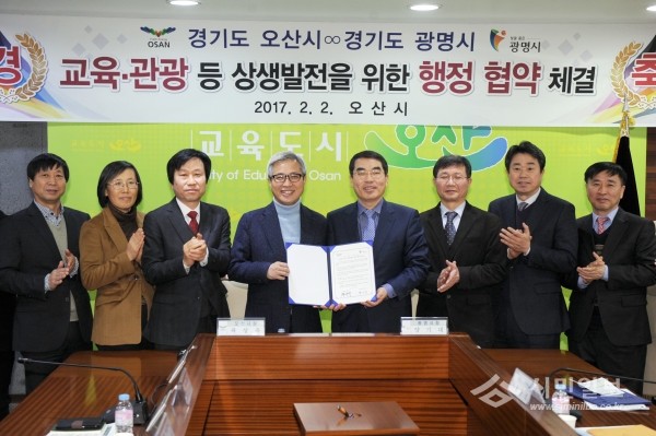 경기 오산시와 광명시는 2일 교육·관광·문화 등 각 분야에서 상생협력한다는 내용의 행정협약을 체결했다. 사진은 곽상욱 오산시장(왼쪽 네번째)와 양기대 광명시장(오른쪽 네번째)이 협약 후 기념촬영을 하는 모습.(사진제공=오산시청)