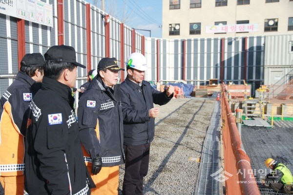 지난 2일 서울 구로소방서는 오후 3시 건축 공사장 화재예방 및 안전사고 방지를 위해 공사현장 긴급 현장점검을 실시했다. 사진은 장현태 서장이 관계자에게 공사진행 현황에 대한 설명을 듣는 모습.(사진제공=구로소방서)