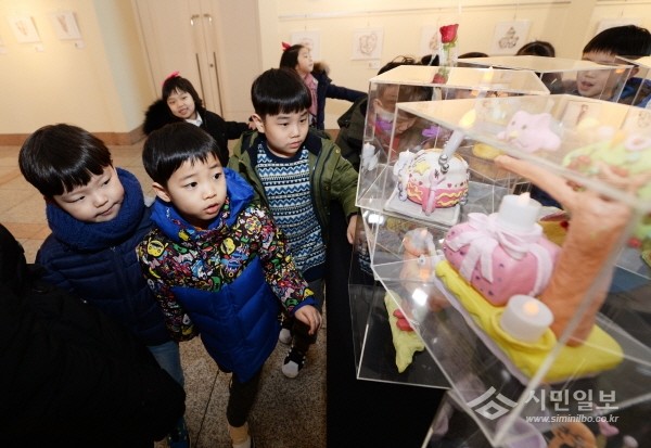 동대문구는 지난 2일 오전 구청 아트갤러리에서 ‘그림유치원 아뜰리에 유아작품 전시회’를 개최했다. 사진은 전시회에 참석한 어린이들이 작품을 감상하는 모습.(사진제공=동대문구청)