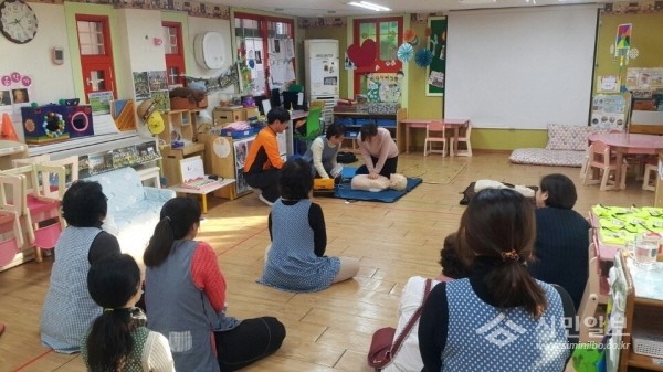 마포소방서는 지난 1일 오후 공덕어린이집 보육교사 10여명을 대상으로 심폐소생술과 응급처치방법 등 소방안전교육을 실시했다. 사진은 참여자들이 심폐소생술 실습을 하는 모습.(사진제공=마포소방서)
