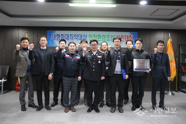 경기 화성소방서는 지난 2일 2층 소회의실에서 지역내 대형화재취약대상의 자율안전관리 강화를 위한 대형화재취약대상 안전환경조성 경진대회를 개최했다. 사진은 관계자들이 기념촬영을 하는 모습.(사진제공=화성소방서)