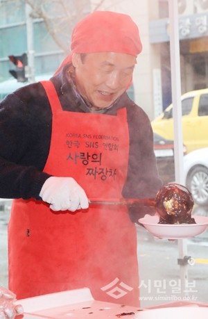 국민의당과의 통합에 속도를 내고 있는 손학규 국민주권개혁회의 의장이 5일 오전 광명시 하안동 주공아파트에서 한국SNS연합회 회원들과 함께 홀몸 노인과 장애인을 위한 ‘사랑의 짜장면’을 만든 뒤 배식을 하고 있다.