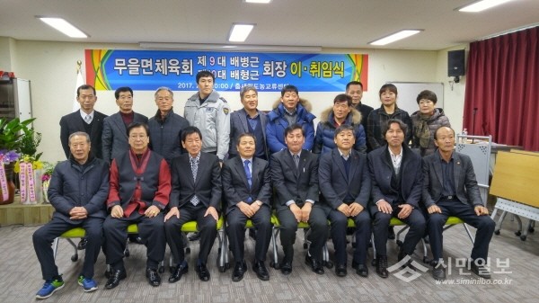 경북 구미시 무을면에서는 지난 3일 춤세권도농교류센터 회의실에서 도·시의원 및 지역내 기관 단체장과 체육회원 등 70여명이 참석한 가운데 ‘무을면 체육회장 이·취임식’을 개최했다. 사진은 관계자들이 기념촬영하는 모습.(사진제공=구미시청)