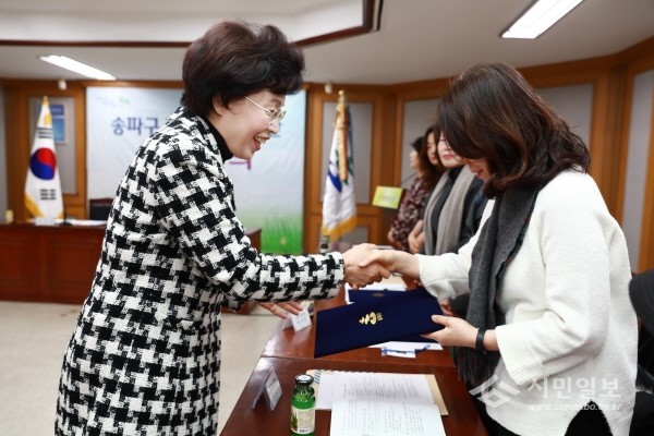 지난 3일 서울 송파구청 기획상황실에서 열린 ‘주부구정평가단 월례회의’에 참석한 박춘희 구청장(왼쪽)이 신규단원에게 위촉장을 수여하고 격려했다. 사진은 박 구청장이 신규단원에게 위촉장을 수여하고 있는 모습.(사진제공=송파구청)