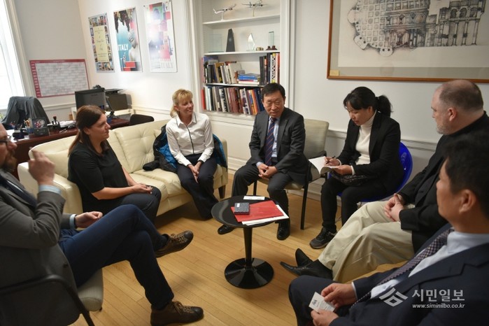 최근 제종길 경기 안산시장(가운데)은 뉴욕 UN플라자에서 세계생태관광협회(TIES) 캘리 브리커 회장(왼쪽에서 세 번째)과 존 브루노 전무이사 등과 함께 ‘2017 생태관광 및 지속가능 관광 국제콘퍼런스’ 개최관련 협의를 진행했다.(사진제공=안산시청)