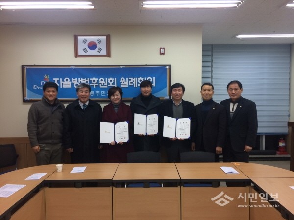 최근 주민들의 편안한 일상생활과 지역발전을 위해 활동하는 경기 동두천시 송내동 자율방범후원회가 월례회의를 열고 3명의 신규위원을 위촉했다. 사진은 신규위원들이 임명장을 들고 기념촬영하는 모습.(사진제공=동두천시)