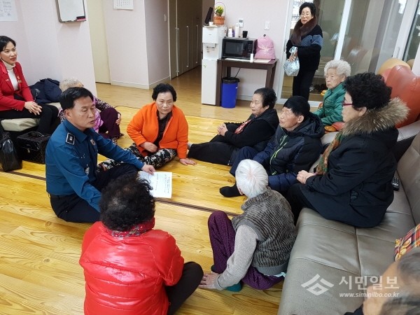 충남 아산경찰서는 지난 6일 지역내 노인정을 문안순찰하며 노인들을 대상으로 교통사고 및 보이스피싱 피해 예방을 위한 홍보 활동을 전개했다. 사진은 경찰관이 노인들과 이야기를 나누는 모습.(사진제공=아산경찰서)