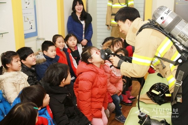 지난 6일 구로소방서는 3층 소방안전체험교실에서 고척 어린이집 아이들에게 소방안전체험교실을 운영했다. 사진은 어린이들이 공기호흡기 마스크체험을 하고 있는 모습.(사진제공=구로소방서)
