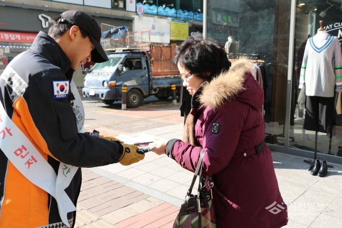 경기 군포소방서는 지난 6일 오후 산본중심상가에서 제251차 ‘안전점검의 날’을 맞아 군포시청 및 유관기관과 함께 화재예방 및 겨울철 안전수칙을 홍보했다. 사진은 소방공무원이 시민과 이야기를 나누는 모습.(사진제공=군포소방서)