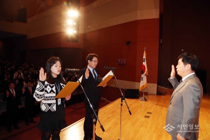 경기 용인시는 지난 6일 시청 에이스홀에서 열린 월례회의에서 직원 500여명이 참석한 가운데 청렴한 공직사회 조성을 위한 ‘청렴실천 결의대회’를 실시했다. 사진은 정찬민 시장이 직원들의 결의를 받고 있는 모습.(사진제공=용인시청)