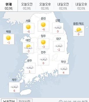 오늘(8일) 오전 서울은 영하 4도, 대전 영하 4도, 춘천 영하 6도, 광주 영하 2도, 전주 영하 3도, 부산 4도를 나타냈다.