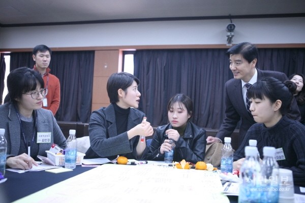 지난 7일 강동구는 구청 대강당에서 겨울방학 구청 아르바이트 참여 대학생, 지역내 청년창업가 등 80여명과 함께 ‘내가 바라는 청년정책’을 주제로 토론회를 개최했다. 사진은 이해식 구청장(오른쪽 뒤)이 참가자 의견을 듣고있는 모습.(사진제공=강동구청)