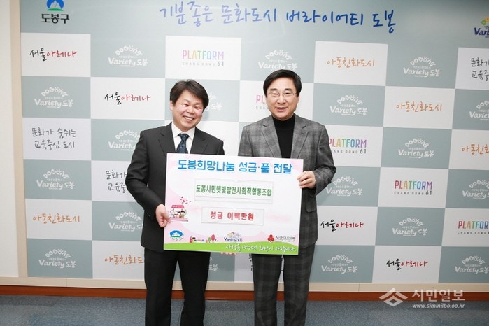 최근 서울 도봉시민햇빛발전사회적협동조합이 도봉시민햇빛나눔발전소 제1·2호기에서 얻은 발전수익금 200만원을 구에 성금으로 기탁했다. 사진은 이동진 구청장(오른쪽)과 두호균 조합이사장이 기념촬영을 하는 모습.(사진제공=도봉구청)
