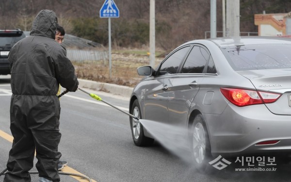 | ▲ 8일 오후 구제역 확진 판정이 내려진 전북 정읍시 산내면 한 한우농장 인근에서 방역당국 관계자들이 차량을 소독하고 있다.(사진제공=연합뉴스) | ||