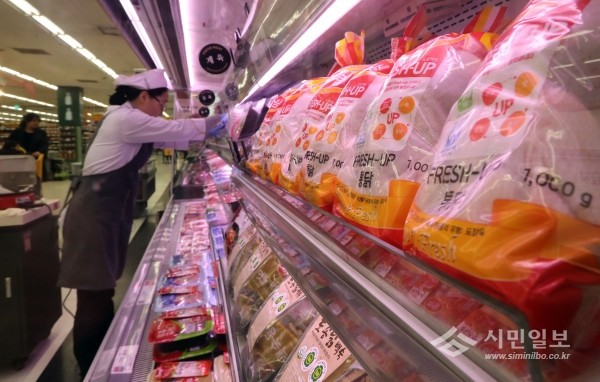 | ▲ 8일 오후 서울 성동구 소재 대형마트에서 한 직원이 닭고기 판매대를 정리하고 있다.(사진제공=연합뉴스) | ||