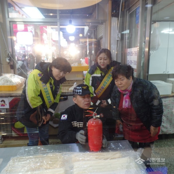 서울 강남소방서는 지난 8일 영동전통시장에서 소방공무원 및 의용소방대원 54여명이 참여해 시장 관계인을 대상으로 '소화기 체험교육'을 실시했다. 사진은 소방공무원이 상인에게 소화기 사용방법에 대해 설명하는 모습.(사진제공=강남소방서)