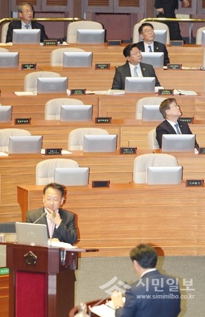 유일호 경제부총리 겸 기획재정부 장관이 9일 오후 국회에서 열린 경제분야 대정부질문에 참석, 국민의당 김관영 의원 질문을 듣고 있다. 유 경제부총리 뒤쪽에 위치한 황교안 대통령 권한대행 국무총리 자리가 비어있다.