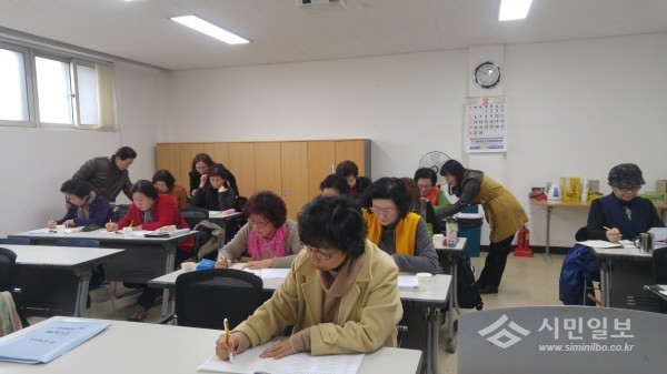 충남 아산교육지원청 아산도서관에서 운영 중인 노인 대상 예비중학 '청춘교실' 영어수업에 지난 8일 생활영어 동아리 회원들이 재능기부 보조교사로 참여했다. 사진은 동아리 회원들이 영어수업을 진행하는 모습.(사진제공=아산교육지원청)