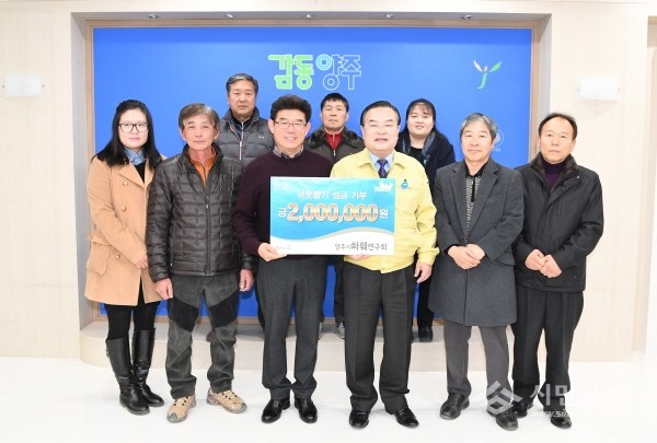 경기 양주시농업기술센터에서 육성하고 있는 화훼연구회는 지난 9일 저득층 및 사회 소외계층 돕기 성금 200만원을 양주시에 전달했다. 사진은 이성호 시장(오른쪽 세 번째) 및 관계자들이 기념촬영을 하는 모습.(사진제공=양주시청)