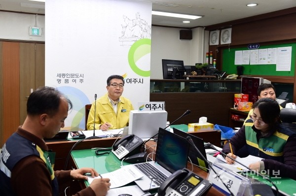 최근 원경희 경기 여주시장은 경기도지사 주재 구제역·고병원성 조류인플루엔자(AI) 방역대책 단체장 영상회의에 참석했다. 사진은 원 시장(가운데)이 영상회의 참석해 회의 내용을 듣고 있는 모습.(사진제공=여주시청)