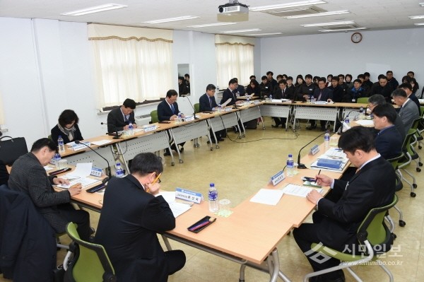 김석준 부산시교육감은 지난 8일 오후 2시부터 부산학생교육원과 부산학생예술문화회관을 잇따라 방문, 올해 주요업무계획을 보고 받고 참석 공무원들과 현안사항에 대해 토론하고 있다.(사진제공=부산시교육청)