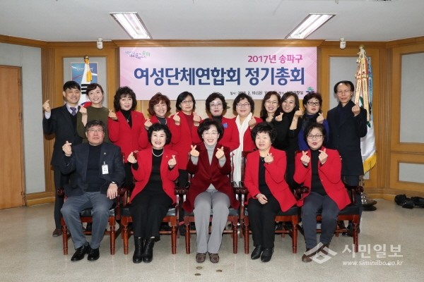 박춘희 서울 송파구청장은 10일 구청 기획상황실에서 열린 ‘여성단체연합회 정기총회’에 참석했다. 사진은 박 구청장(앞줄 가운데)이 연합회 관계자들과 기념촬영을 하는 모습.(사진제공=송파구청)