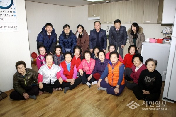 서울 강북구의회 한동진 부의장이 지난 10일 정월 대보름을 맞아 경로당 초청으로 송중경로당을 방문해 경로당시설을 돌아보고 민원을 청취했다. 사진은 한동진 부의장(뒷줄 오른쪽 세번째)이 동 관계자, 경로당 이용 노인들과 기념촬영을 하는 모습.