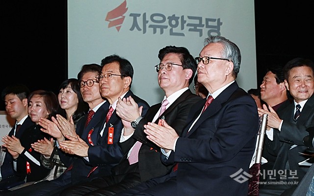 자유한국당 인명진 비상대책위원장, 정우택 원내대표 등 당 지도부가 13일 오후 서울 영등포 타임스퀘어 아모리스홀에서 열린 새누리당 전국위원회에서 당명을 자유한국당으로 변경하는 안이 통과된 뒤 당명과 로고가 공개되자 박수를 치고 있다.