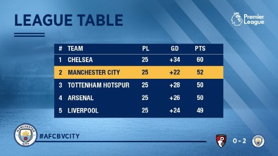이후 전반 29분 라임 스털링이 선제골을 기록하며 승기를 잡았다. 결국 후반 69분에는 타이론 밍스의 자책골까지 나오며 본머스를 무너지고 말았다. 맨체스터 시티는 이에 따라 EPL 단독 2위에 랭크되며 상승세를 나타냈다.