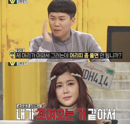 과거 양세형은 MBC 예능프로그램 '오빠생각'에서 머리에 장식이 달린 끈을 두른 솔비에게 "제 머리가 아파서 그런데 그 머리띠 좀 풀며 안되냐"고 말했다.