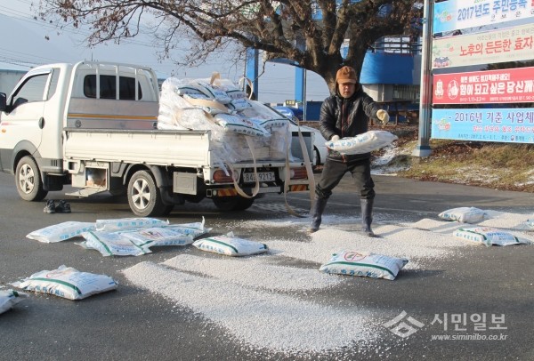 | ▲ 14일 충북 보은군 탄부면 구암리에서 한 주민이 도로 위에 생석회를 살포하고 있다.(사진제공=연합뉴스) | ||
