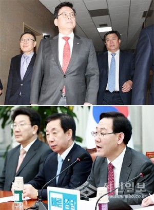 정우택 자유한국당 원내대표가 14일 오전 전날 국회 환경노동위원회에서 더불어민주당과 국민의당 주도로 삼성전자와 MBC 등에 대한 청문회를 의결한 것을 두고 항의하기 위해 의장실로 향하고 있다. 왼쪽부터 정태옥 원내부대표, 정우택 원내대표, 김선동 원내수석부대표(왼쪽). 바른정당 주호영 원내대표도 14일 오전 국회 당대표실에서 열린 원내대책회의에 참석해 삼성, MBC 등 청문회에 대한 일방 처리를 주장하며 비판하고 있다.