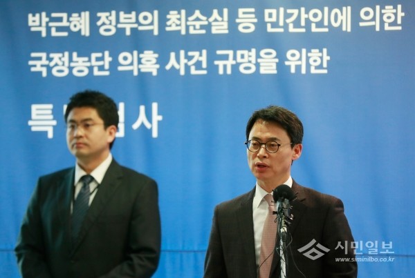| ▲ 이규철 특검팀 대변인이 14일 오후 서울 강남구 대치동 특검사무실에서 열린 정례브리핑에서 발언하고 있다.(사진제공=연합뉴스) | ||