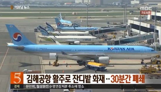 김해국제공항에서 새를 쫓기 위한 폭음탄이 잔디밭에 떨어져 화재가 발생했다.