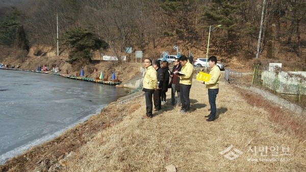 경기 이천시가 국가안전대진단과 관련해 지난 14일 신둔면 고척리 275번지 소재 학암저수지에 대해 현장점검을 실시했다. 사진은 박태수 부시장(맨 앞)을 비롯한 간부 공무원들이 저수지를 살펴보는 모습.(사진제공=이천시청)