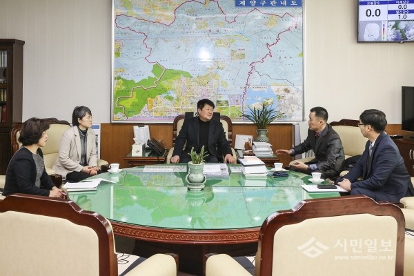 인천 계양구는 지난 14일 구 한의사회와 ‘경로당 한방주치의 사업’ 추진을 위한 협약을 체결했다. 사진은 박형우 구청장(가운데)이 한의사회 관계자들과 이야기를 나누는 모습.(사진제공=계양구청)