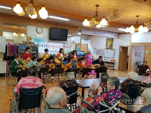 경기 수원시 권선구에서는 15일 복조리 공연단이 노인요양시설을 방문해 노인들에게 따뜻한 문화공연을 선사했다. 사진은 공연단이 노인들에게 통기타 연주를 선보이는 모습.(사진제공=권선구청)