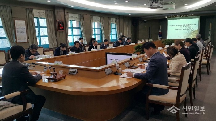 지난 14일 경기 동두천시가 시청 상황실에서 ‘2017년 제1회 경관위원회’를 열고, 탑동동 산18번지 일원에 조성되는 ‘산림 휴양형 MTB체험단지’의 건축물의 경관에 대해 심도있는 토론을 진행했다. 사진은 회의가 진행 중인 모습.(사진제공=동두천시청)