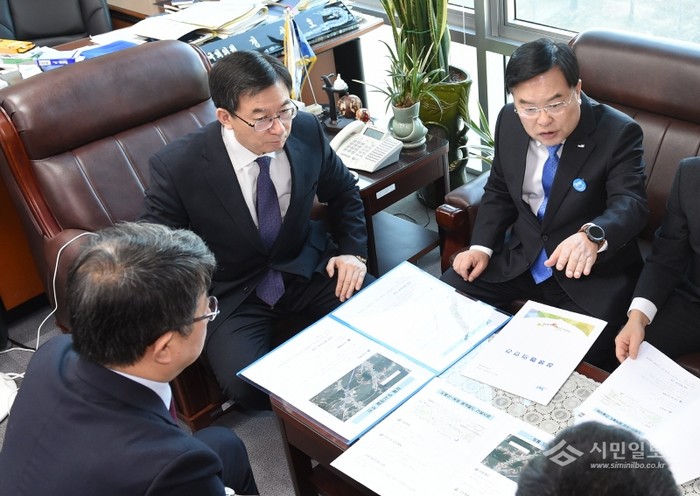이성호 경기 양주시장은 지난 14일 정성호 국회의원과 '도봉산~옥정 광역철도'를 양주신도시(옥정)까지 연장해야 한다는 데 뜻을 모으고 박상우 LH공사 사장을 면담했다. 사진은 이 시장(오른쪽)과 정 의원(가운데)이 박 사장과 토의하는 모습.(사진제공=양주시청)