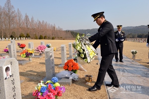 최근 경기 포천소방서는 이원창 소방행정과장 등 소방관들이 참석한 가운데 대전 국립현충원 소방공무원 묘역에서 고 윤영수 지방소방장의 순직 4주기 추념식을 개최했다. 사진은 추념식에서 헌화하는 모습.(사진제공=포천소방서)