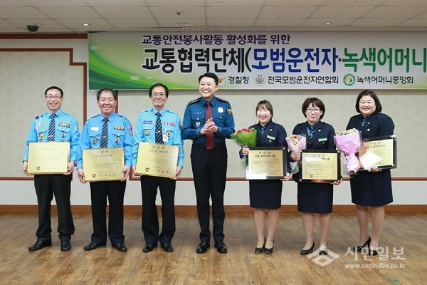 지난 14일 인천 부평경찰서 녹색어머니회는 '2016년 교통분야' 협력 단체 중 전국 1위 '으뜸 녹색어머니회'에 선정돼 경찰청 간담회에 참석했다. 사진은 녹색어머니회 관계자들이 이철성 경찰청장(가운데), 모범운전자연합회 관계자들과 기념촬영을 하는 모습.(사진제공=부평경찰서)