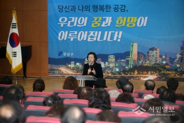 지난 15일 강남구가 삼성2문화센터에서 삼성2동·역삼1동주민들을 대상으로 한해 살림살이를 설명하고 주민 건의사항을 청취하는 ‘2017 예산보고회’를 개최했다. 사진은 설명회에 참석한 신연희 구청장이 인사말을 하고 있는 모습.(사진제공=강남구청)