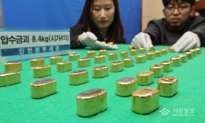 인천본부세관은 시가 243억원 상당의 금괴 476kg을 밀수출입한 일당 9명을 검거했다고 16일 밝혔다. 이들은 인체에 삽입이 용이하도록 금괴를 200g 상당의 타원 형태로 제조한 뒤 항문에 은닉하는 수법으로 한사람이 최다 100여회에 걸쳐 금괴를 밀수했다. 16일 오전 인천공항 인천본부세관에서 열린 검거브리핑에서 직원들이 금괴를 정리하고 있다.