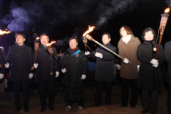 | ▲ 강동구의회 의원들이 달집을 태우기 위해 횃불에 불을 붙이고 있다. (좌측부터) 김영철 의원, 조용구 의원, 신윤재 의원, 송명화 부의장, 신무연 의원 | ||