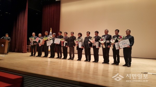 최근 경기 안산시 상하수도사업소가 환경부에서 주관한 ‘2016년 전국 수도사업 운영 및 관리 실태 평가’에서 우수기관으로 선정됐다. 사진은 시상식에서 최현숙 정수과장(왼쪽 여덟 번째)이 다른 기관 대표와 함께 기념촬영을 하는 모습.(사진제공=안산시청)
