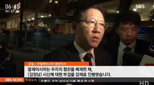 17일 강철 주말레이시아 북한 대사는 쿠알라룸푸르 종합병원 영안실 앞에 나타났다. 이후 그는 “말레이시아는 우리의 참관을 배재한 채 부검을 실시했다”라며 “이는 국제법을 무시하는 인권 침해 행위다”라고 말했다.