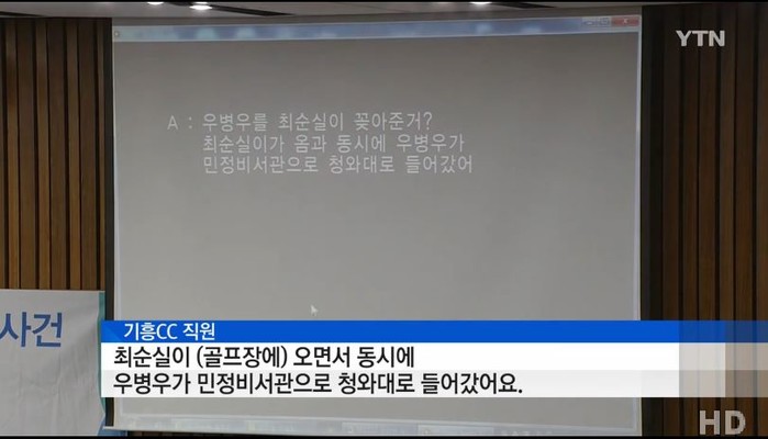 최순실이 (골프장에) 오면서 동시에 우병우가 민정비서관으로 청와대로 들어갔다고 기흥CC 직원이 밝혔으나 우병우는 저는 저런 얘기를 도저히 납득할 수 없습니다. 음성 변조가 돼 있고…라고 밝힌 바 있다.