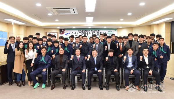 | ▲ 안산시는 지난 1월4일 시민프로축구단 ‘안산그리너스FC’의 2017 시즌 창단 첫 출정식을 열었다. 사진은 제종길 안산시장(가운데) 등 팀 관계자들이 기념촬영을 하는 모습.(사진제공=안산시청) | ||